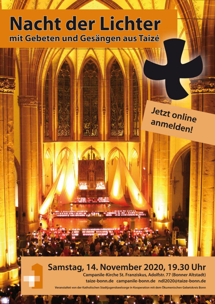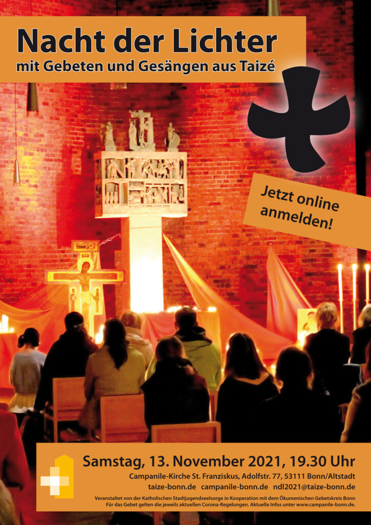 Am Samstag, den 19. November, findet um 19.30 Uhr die diesjährige Bonner Nacht der Lichter mit Gebeten und Gesängen aus Taizé in der Campanile-Kirche St. Franziskus in der Bonner Altstadt statt, zu der wir hiermit sehr gerne einladen. Aktuelle Informationen zur Teilnahme (und den dann ggf. geltenden Hygieneregeln) finden sich beizeiten im Internet unter Campanile-Bonn.de und auf unserer Facebook-Seite.