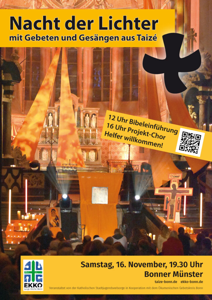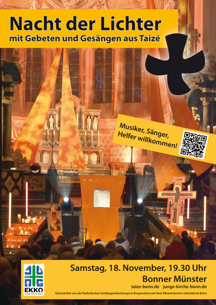 Am 17.11.2009 fand im Bonner Münster (Münsterplatz 53111 Bonn-Zentrum – Google Maps) die jährliche Nacht der Lichter statt. Die Kirche wurde geschmückt von orangenen Tüchern, Ikonen und Kerzen in der Hand der Besucher. Neben mehreren hundert Besuchern aus der ganzen Region war auch Bruder Wolfgang aus Taizé zu Gast. Musikalisch wurde das Gebet von einer Gruppe unterstützt, die sich extra zu dieser Gelegenheit zusammengefunden hatte.